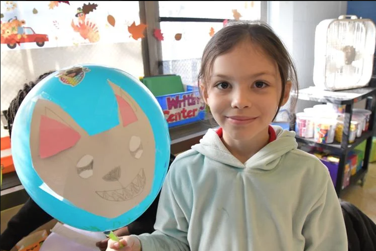 Emma Rosario with her wolf balloon. (credit Philadelphia Tribune Dec 6, 2022)