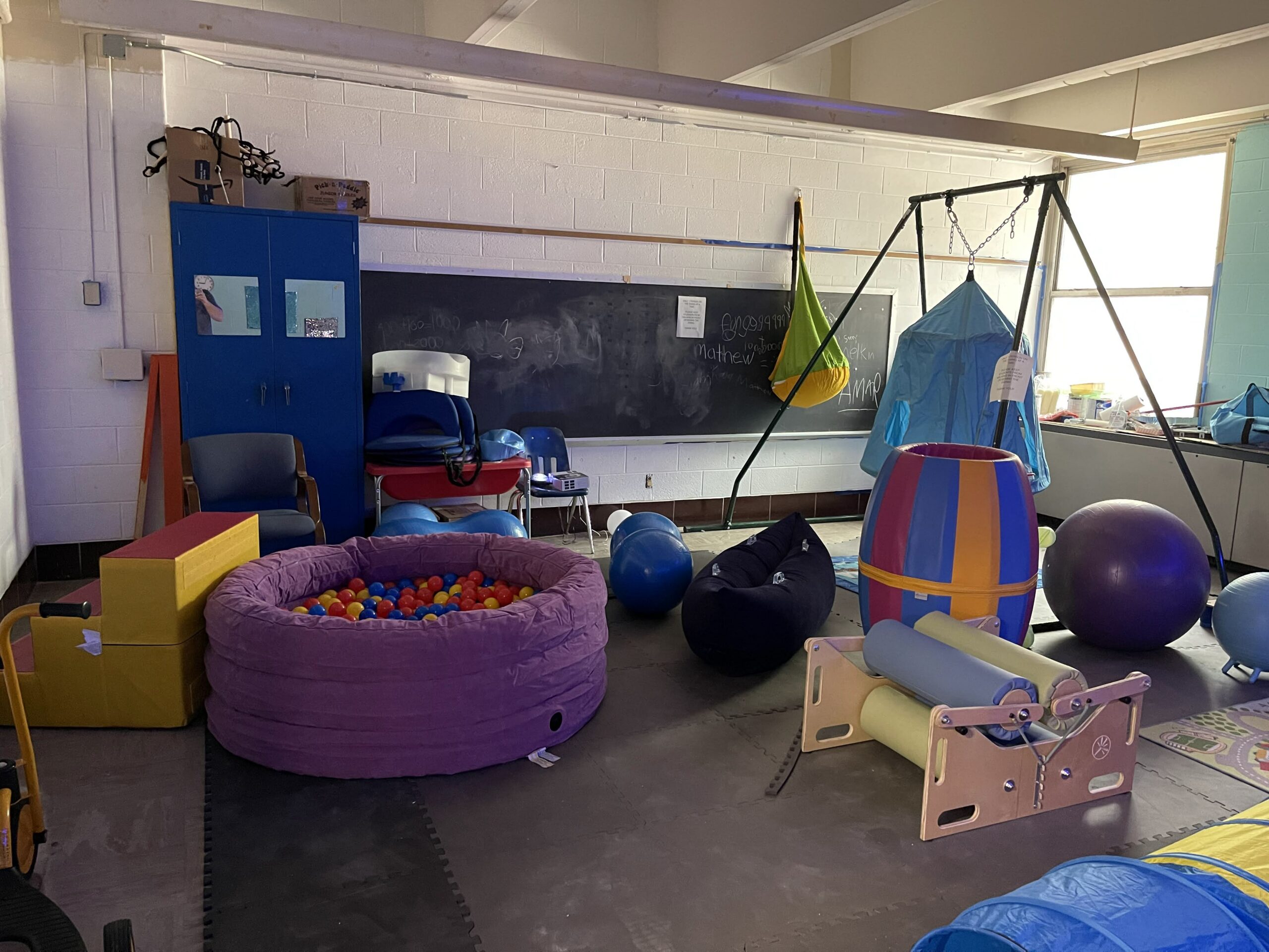 Ball pit, swing, and a squeeze machine